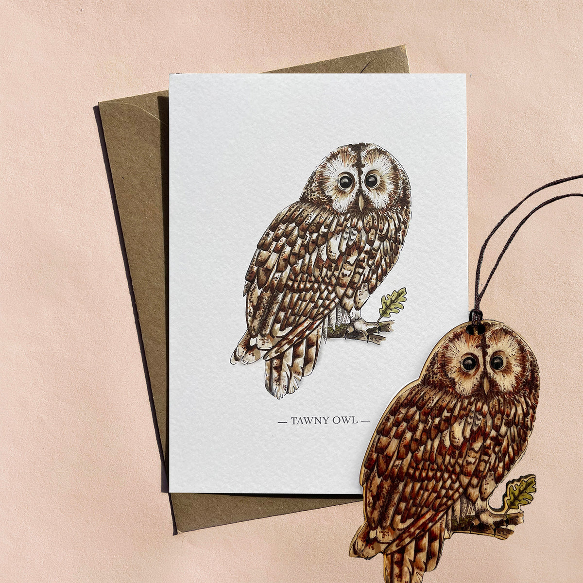Tawny Owl illustrated card with removable wooden decoration Fearless