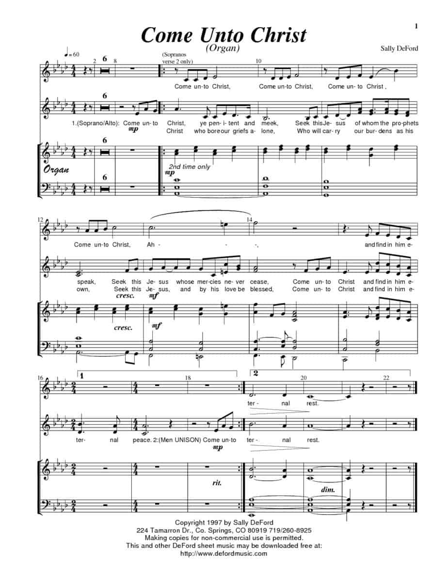 Share, download and print free sheet music of come unto christ lds hymns for piano, guitar, flute and more with the world's largest. The sheet music provides vocal, violin and piano parts for performing the song which encourages listeners to accept christ's love and guidance. The song of the righteous is a prayer unto me, and it shall be answered.