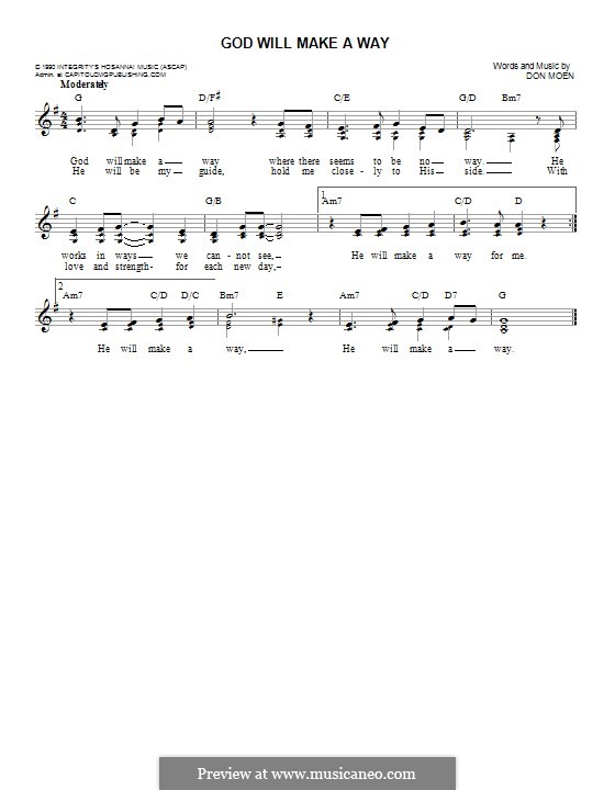 Written for solo instrument (piano). Download don moen god will make a way sheet music here. Printable sheet music arranged for piano & vocal. Share, download and print free sheet music of god will make a way don moen for piano, guitar, flute and more with the world's largest community of. Purchase and print sheet music now!