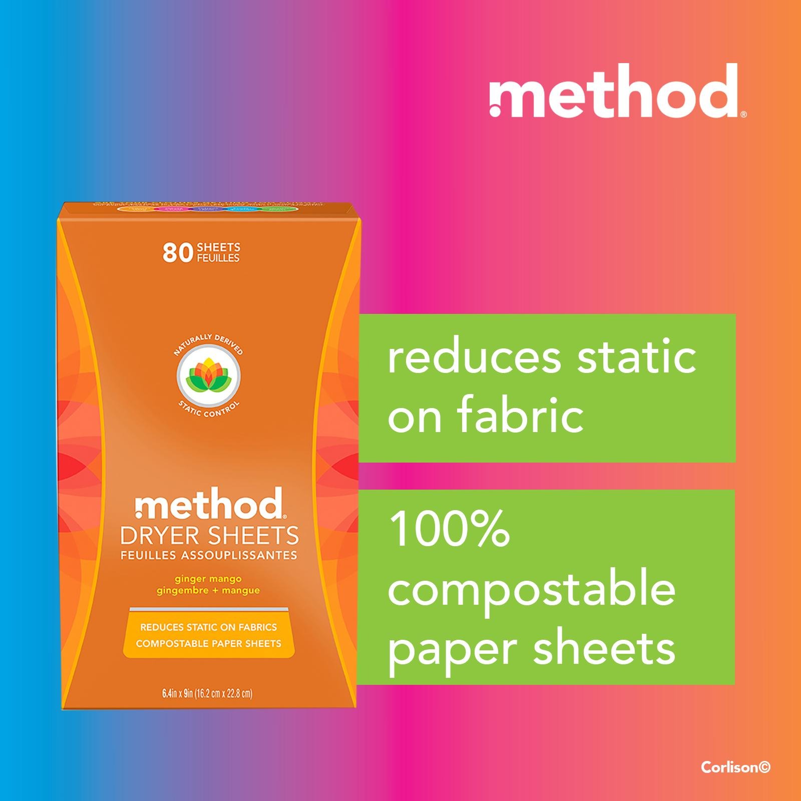 Method Ginger Mango Dryer Sheets - Sometimes you have to take control, especially when it comes to static. Tear it in half at the perforation to reduce the risk of blocking dryer vents. Our dryer sheets reduce static and soften your fabrics. Toss both halves into the dryer along with wet clothing and dry as usual. Sometimes you have to take control, especially when it comes to static. Our dryer sheets reduce static and soften your fabrics.