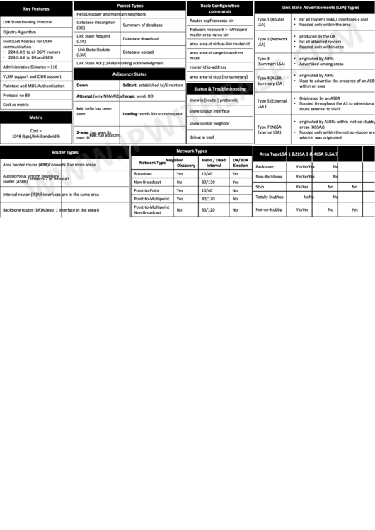 This ospf cheat sheet explains the key features, ospf packet types, lsa types, area types, router types, network types, adjacency states, metrics, basic cli configuration and troubleshooting. Open shortest path first (ospf) is a routing protocol for internet protocol (ip) networks.