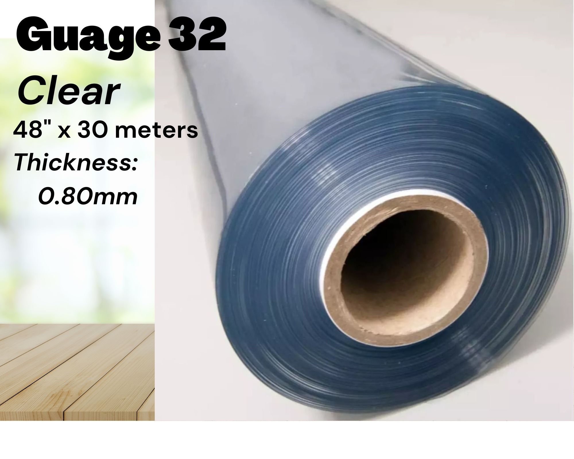 CLEAR PVC PLASTIC COVER SHEET / GUAGE 32 TRANSPARENT / 48"x30m/roll