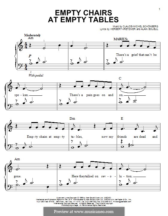 Empty chairs at empty tables (from les miserables) sheet music. Arrangement for piano, vocal, guitar and keyboard. Download and print empty chairs at empty tables sheet music for piano solo by les miserables (musical) from sheet music direct. Share, download and print free sheet music of empty chairs at empty tables les misérables do you hear the people sing for.