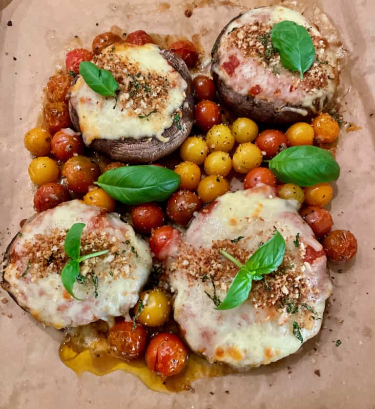 Scatter the mushrooms with the remaining garlic, and season each mushroom with salt and black pepper. Portobello mushrooms are stuffed with marinara and mozzarella cheese before being roasted in. It offers all the delicious flavors of a traditional parmesan dish with. Pile the tomatoes on a sheet pan, add half the garlic, and drizzle with 2 tablespoons of olive oil..