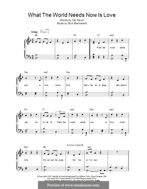 Get what the world needs now is love sheet music by bacharach & david as a digital notation file for piano/keyboard in (transposable). Browse our 37 arrangements of what the world needs now is love. sheet music is available for piano, voice, guitar and 16 others with 17. What the world needs now is love. What the world needs now..